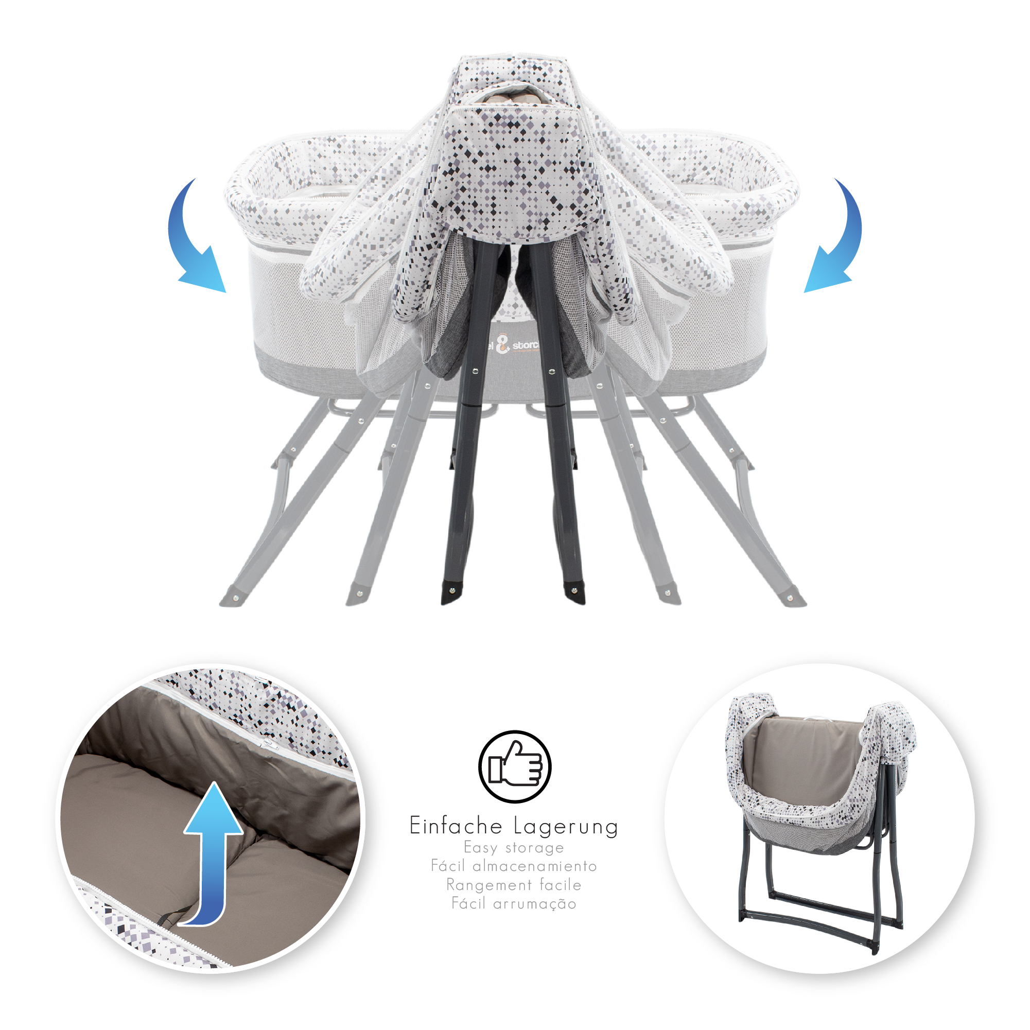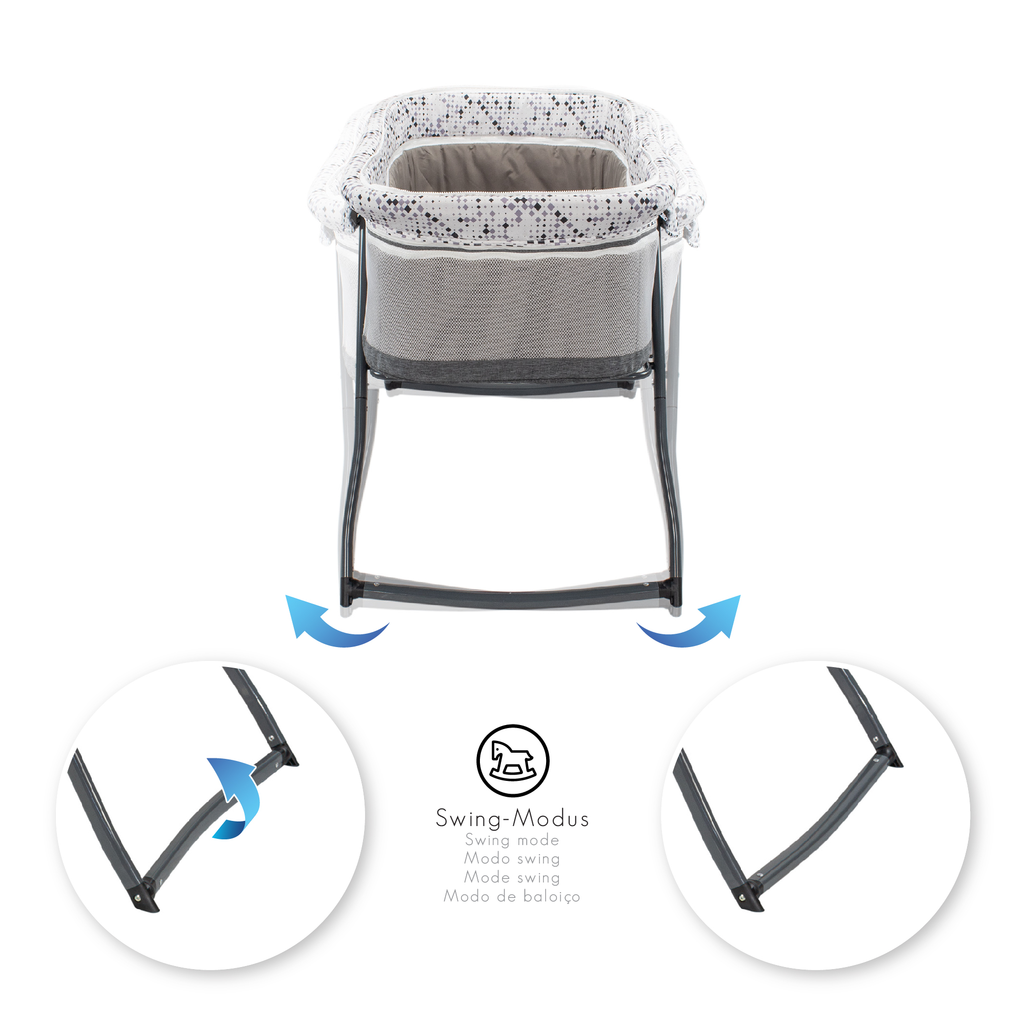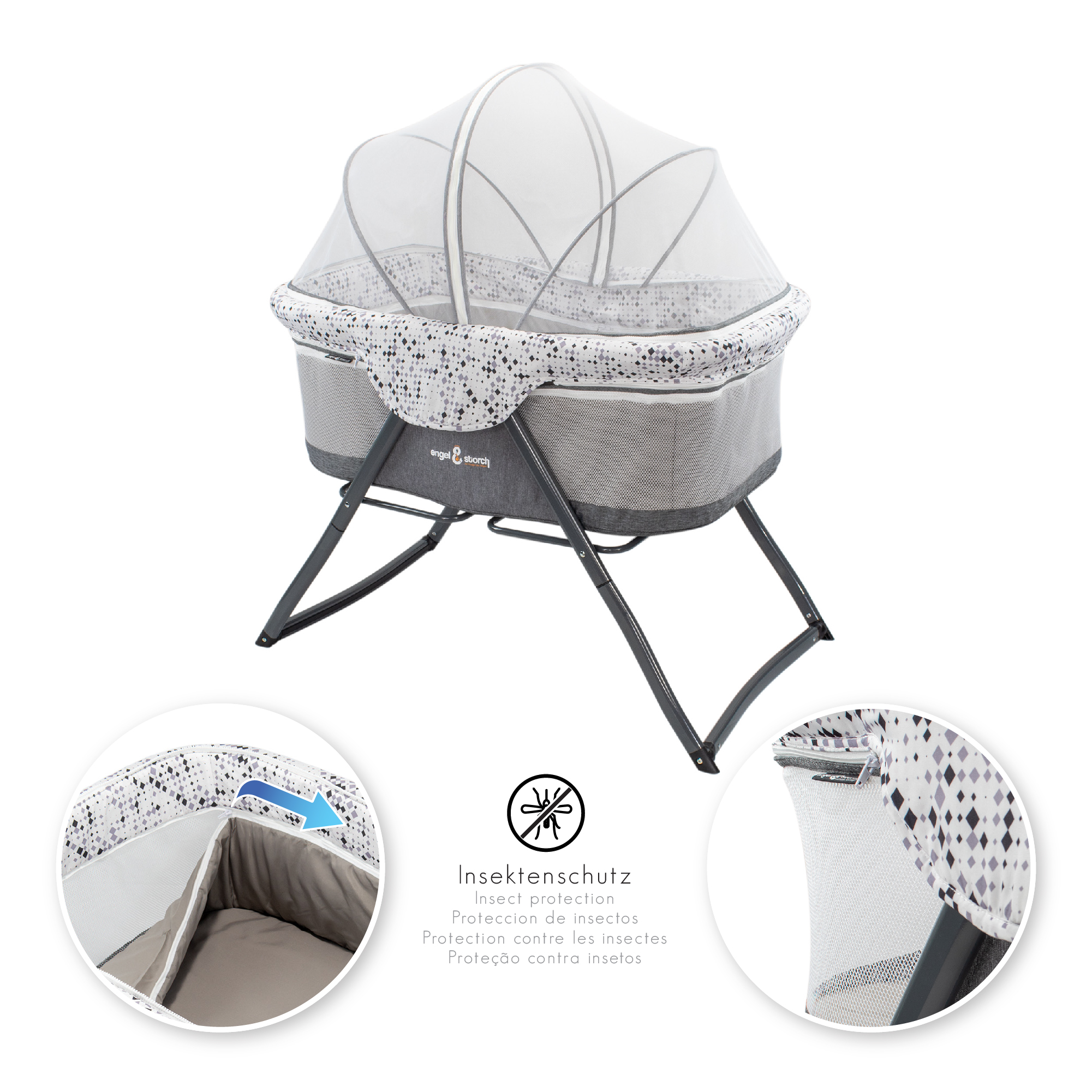 The 3-in-1 baby crib is the perfect solution for our little angels but also for you. You can use the product as a baby crib, side bed, bassinet, bassinet and travel cot. Easy to make is the folding. In a few seconds you have the travel cot stowed in the supplied carry bag(hand luggage compliant). Thus, mobility is guaranteed. You can turn the feet with little effort and thus use the product also as a cradle. See the pictures above. The perfect protection we also provide. Through the mosquito hood your child is protected from any insects but also pets. In addition, the product has a wind and cold protection. This you can also easily remove. The Perfect indoor and outdoor solution.