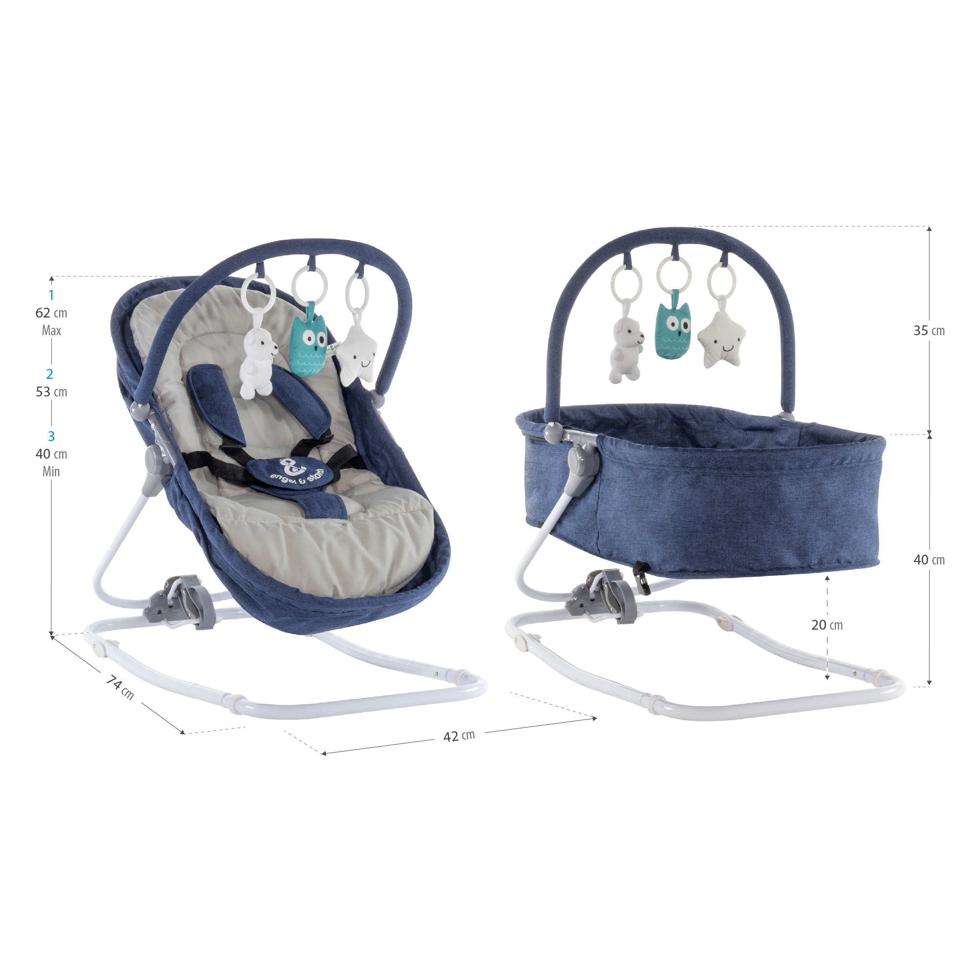 -Dimensions reclining function: 74cm (length) x 42cm (width) x 40cm (height) (with play bar: H 75cm)